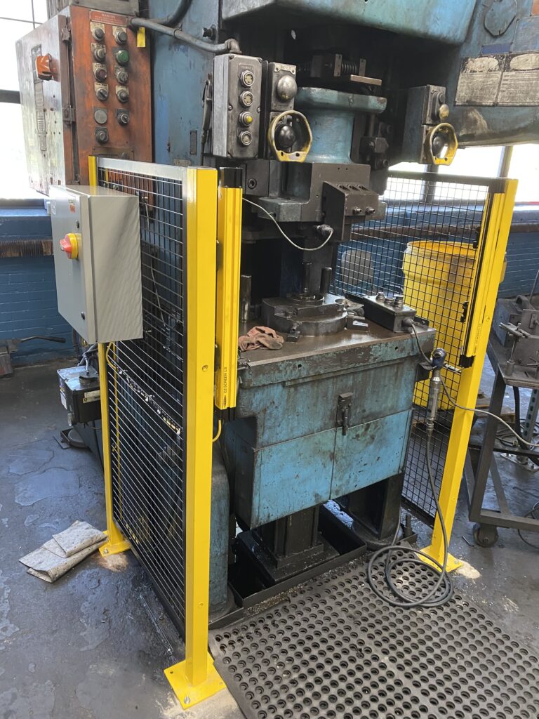 The customer described needing a safety solution allowing operators to access a pressing machine without risk of injury. They required wire mesh panels to restrict access from areas of the press not used by the operator, ensuring hands and other body parts could not accidentally enter hazardous zones. At the same time, the system needed to work in conjunction with a light curtain, which would shut down the press whenever the operator crossed into the protected area. This design enabled operators to safely add or remove products without the risk of being harmed during machine operation, creating a safer and more controlled work environment.
